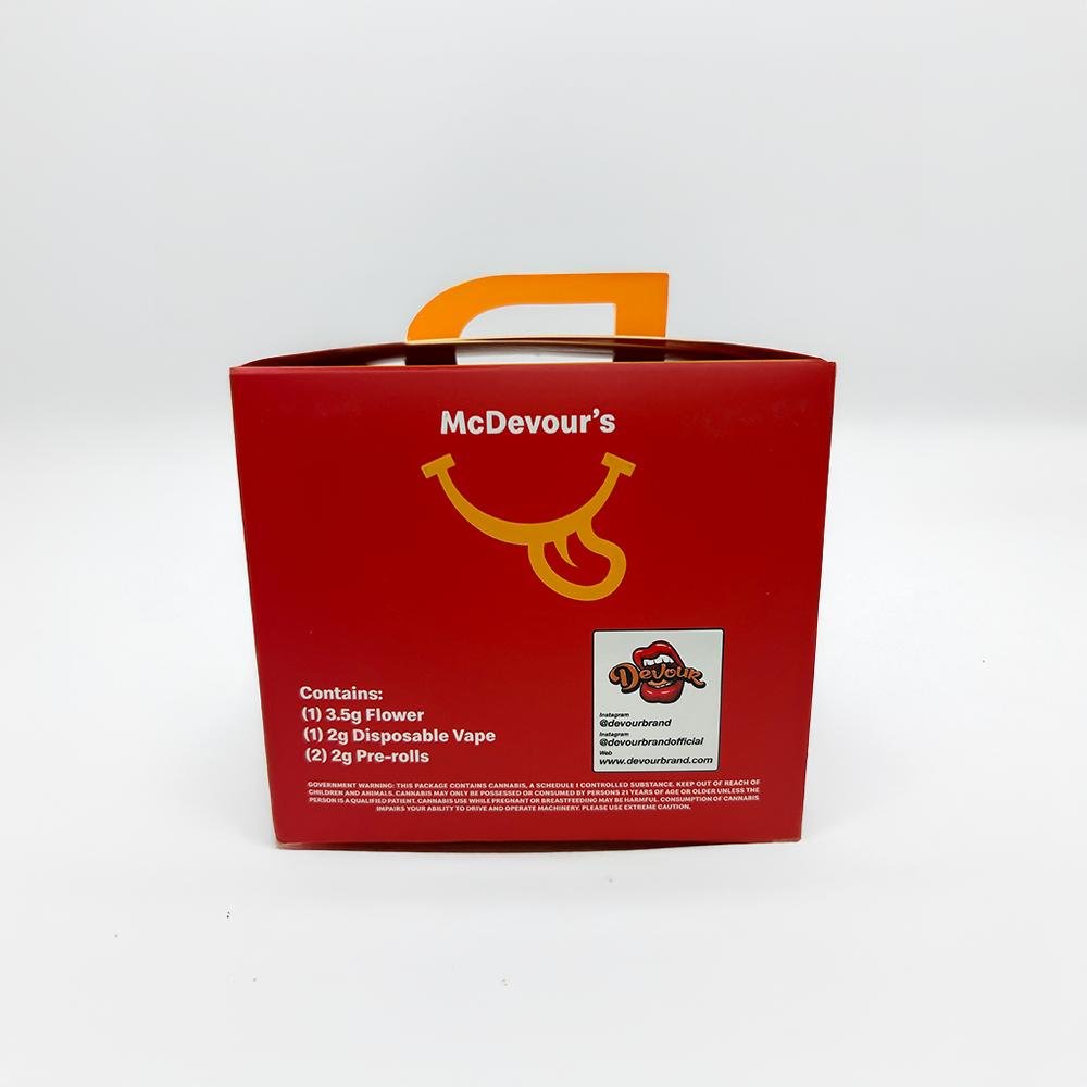 MC Devours Trappy Meal a high-quality, all-in-one bundle designed for both casual smokers and seasoned connoisseurs. Carefully curated to deliver variety, potency, and convenience, this devour trappy meal premium combo includes one 3.5g flower, one 2g disposable vape, and two expertly rolled pre-rolls. Whether you’re kicking back for a solo session or sharing the vibes with friends, this kit is everything you need in one stylish, satisfying package.